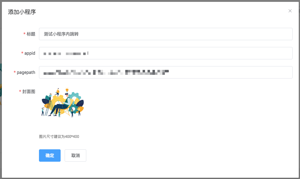 添加小程序时,需要填写标题,小程序的appid及pagepath,封面图片尺寸建议400*400。