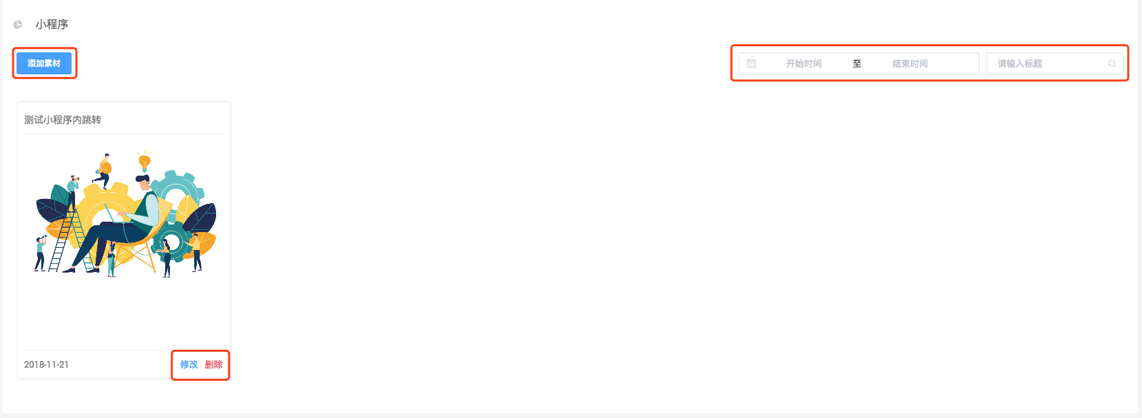 当小程序素材过多时,可以根据添加素材的时间周期或名称来精确查找。