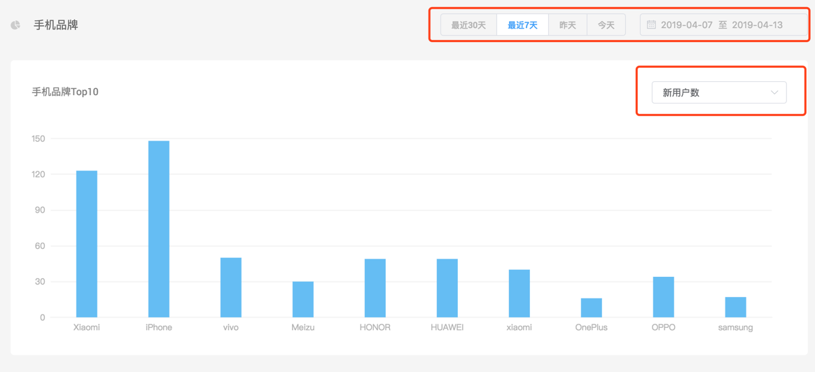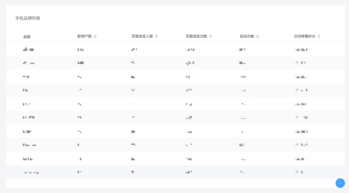 按手机品牌查看新用户数、页面浏览人数、页面浏览次数、启动次数、次均停留时长数量详情。