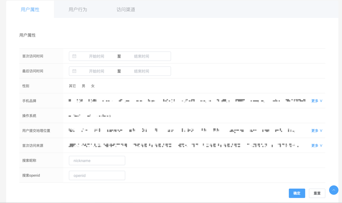 1.根据用户性别属性、行为、访问渠道以及用户的访问时间及访问来源为统计筛选条件。